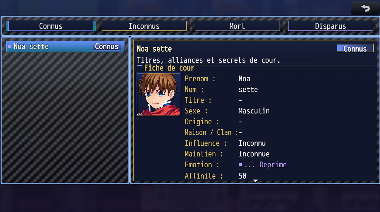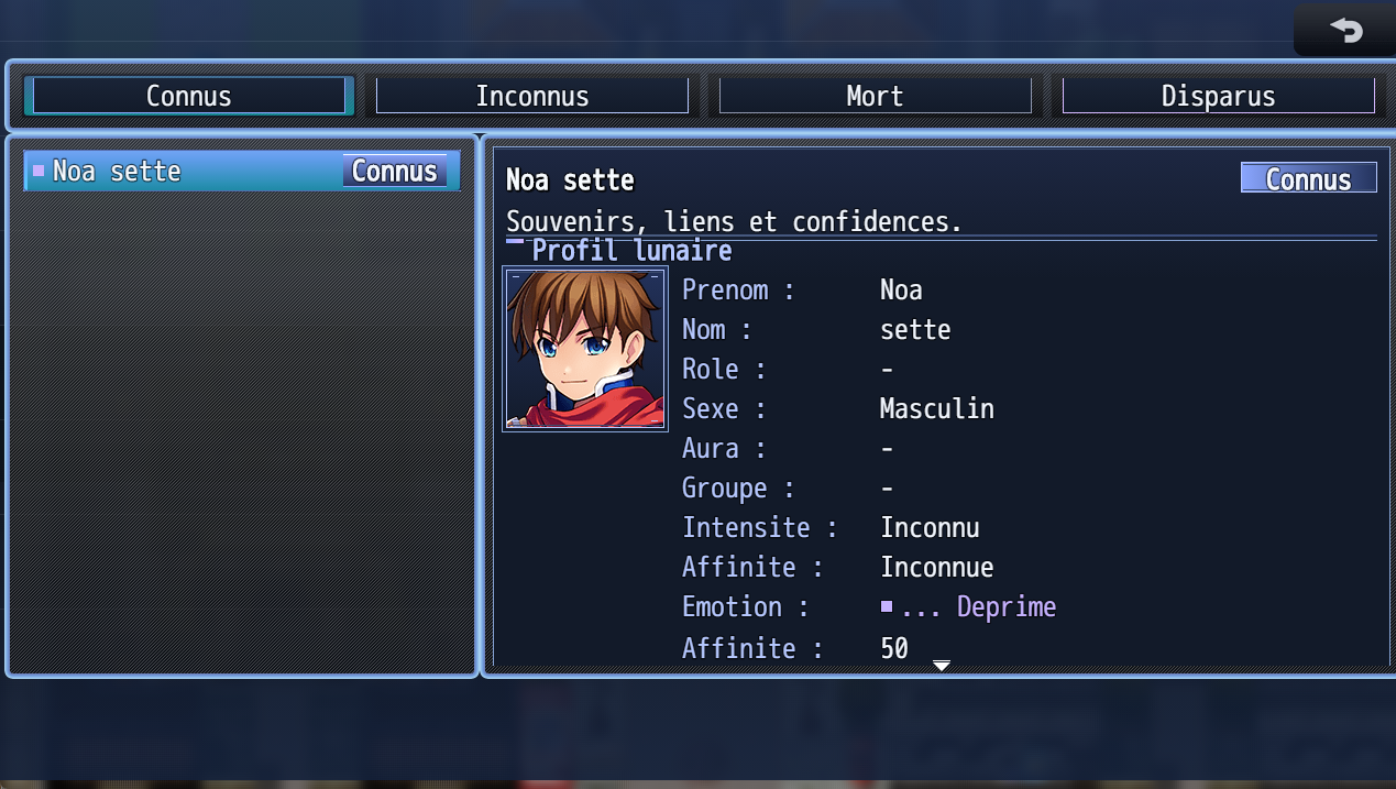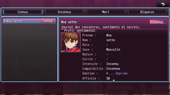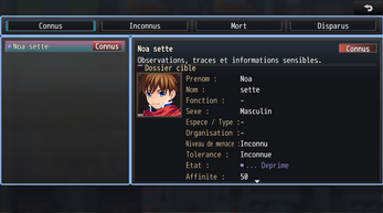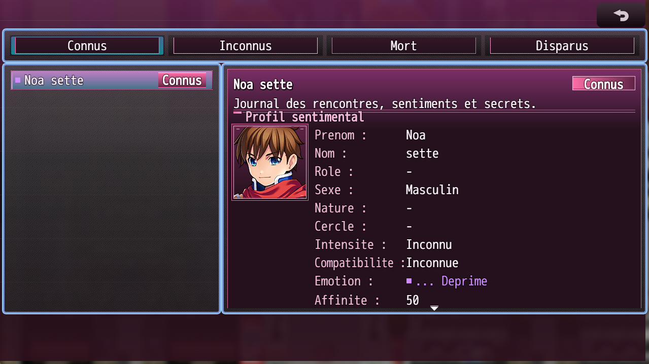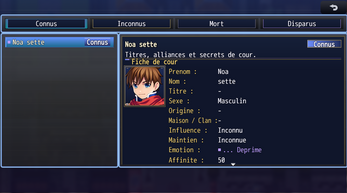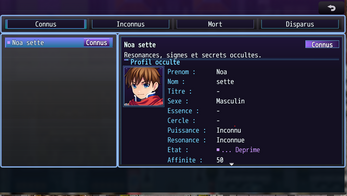 Il permet de suivre les PNJ rencontrés, leur état, leurs émotions, leur affinité avec le joueur, leur historique, leurs secrets, ainsi que de nombreuses informations personnalisables dans une interface élégante et immersive.